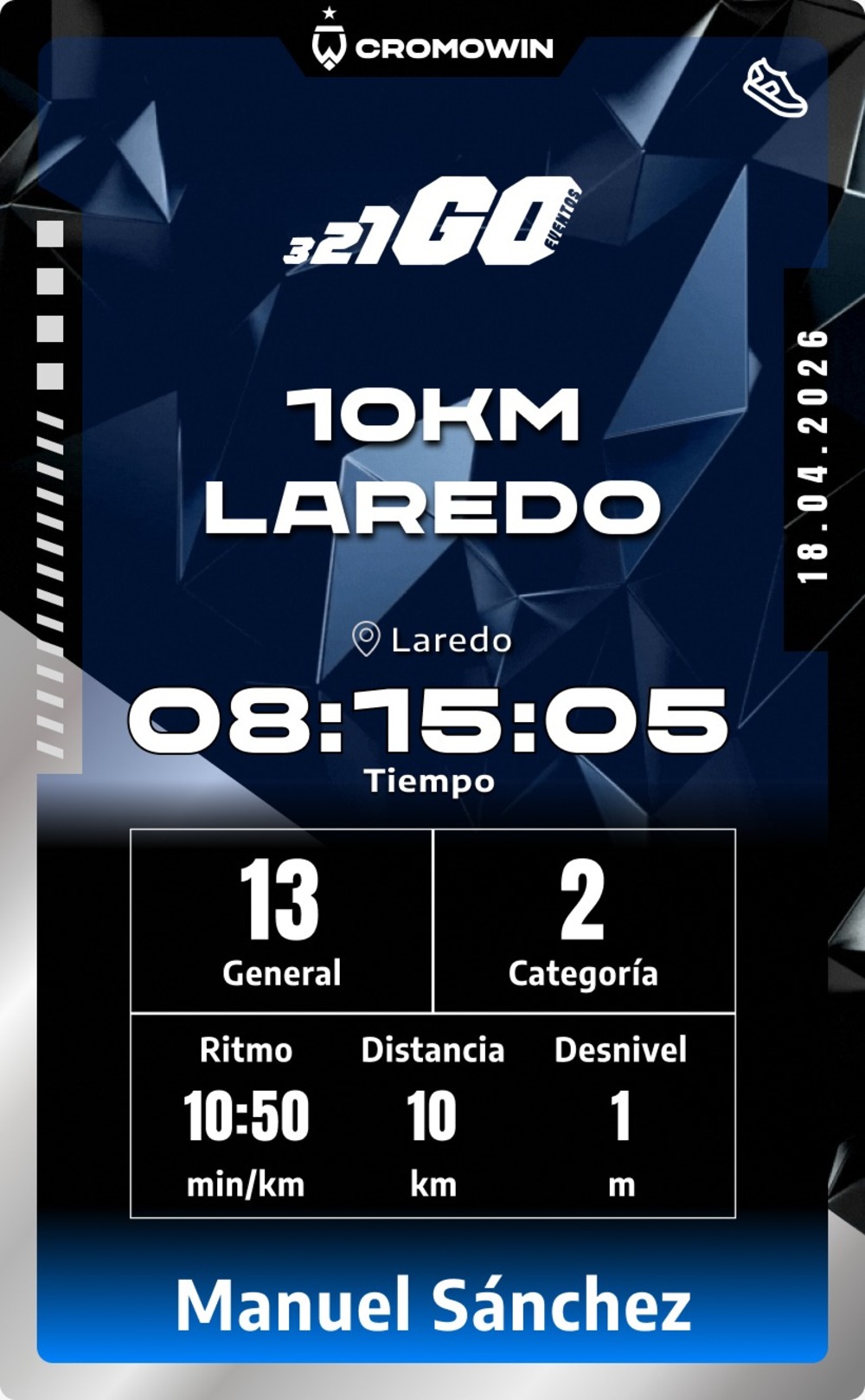 Colecciona tus logros deportivos en formato cromo. Con el Cromo Finisher puedes inmortalizar tu rendimiento en la GTPE de 2026. Personaliza tus logros con datos y fotos oficiales.